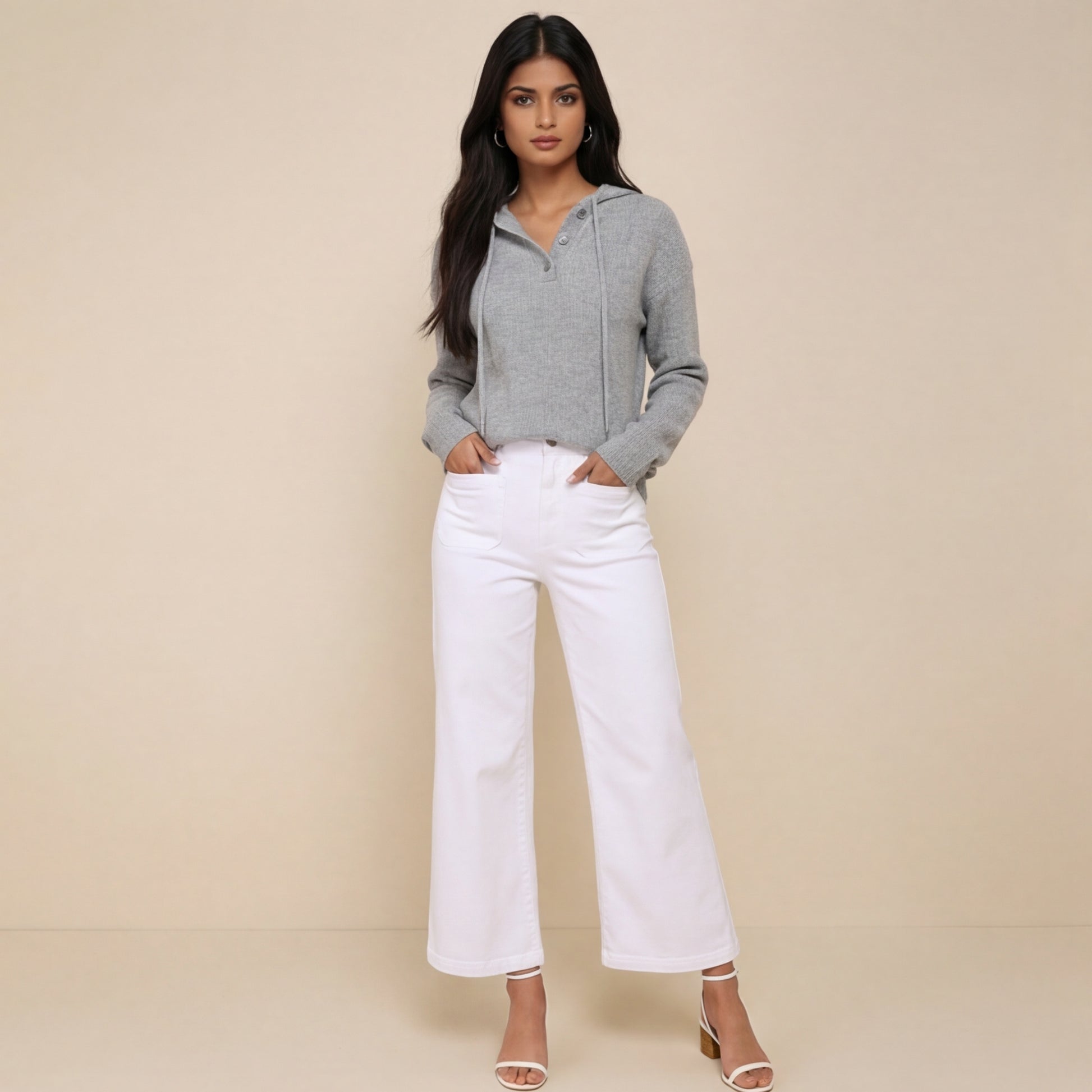 Elevate your wardrobe with the Elise Leroy Luxe Cashmere Sweater. This premium piece features a cozy hood and a stylish V-neckline adorned with buttons and drawstrings, offering both functionality and flair.