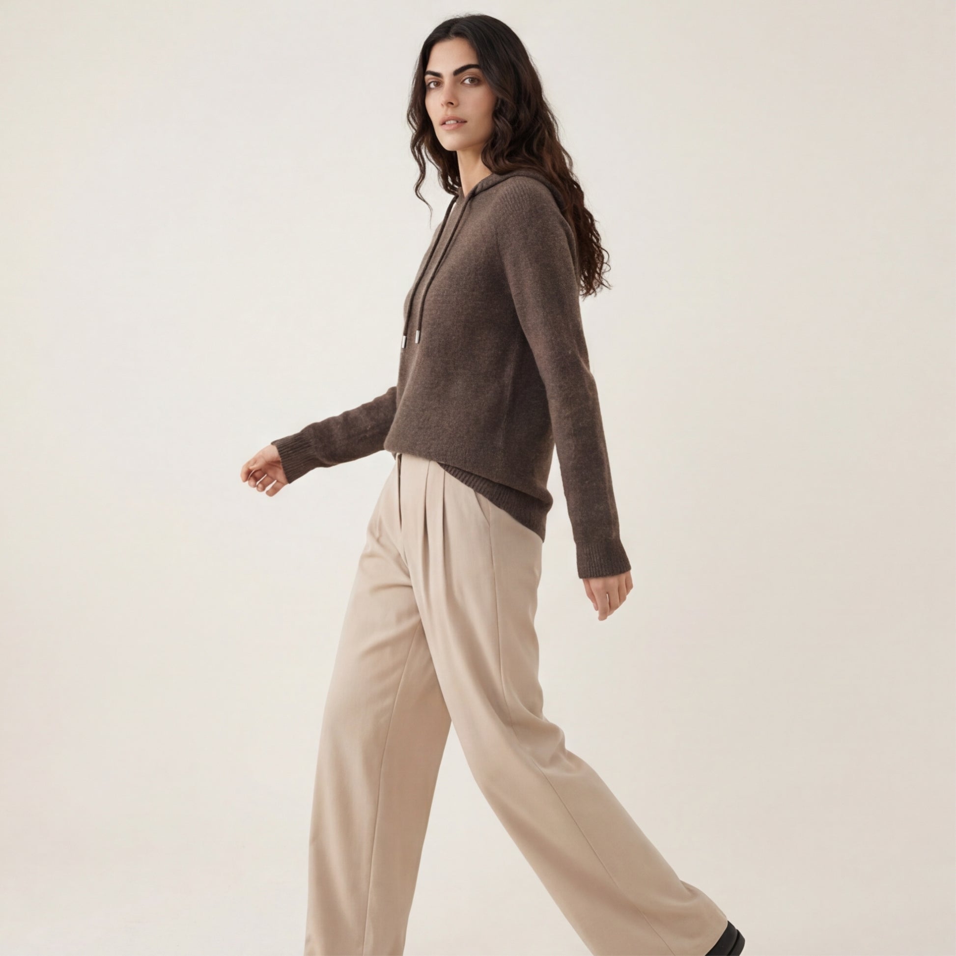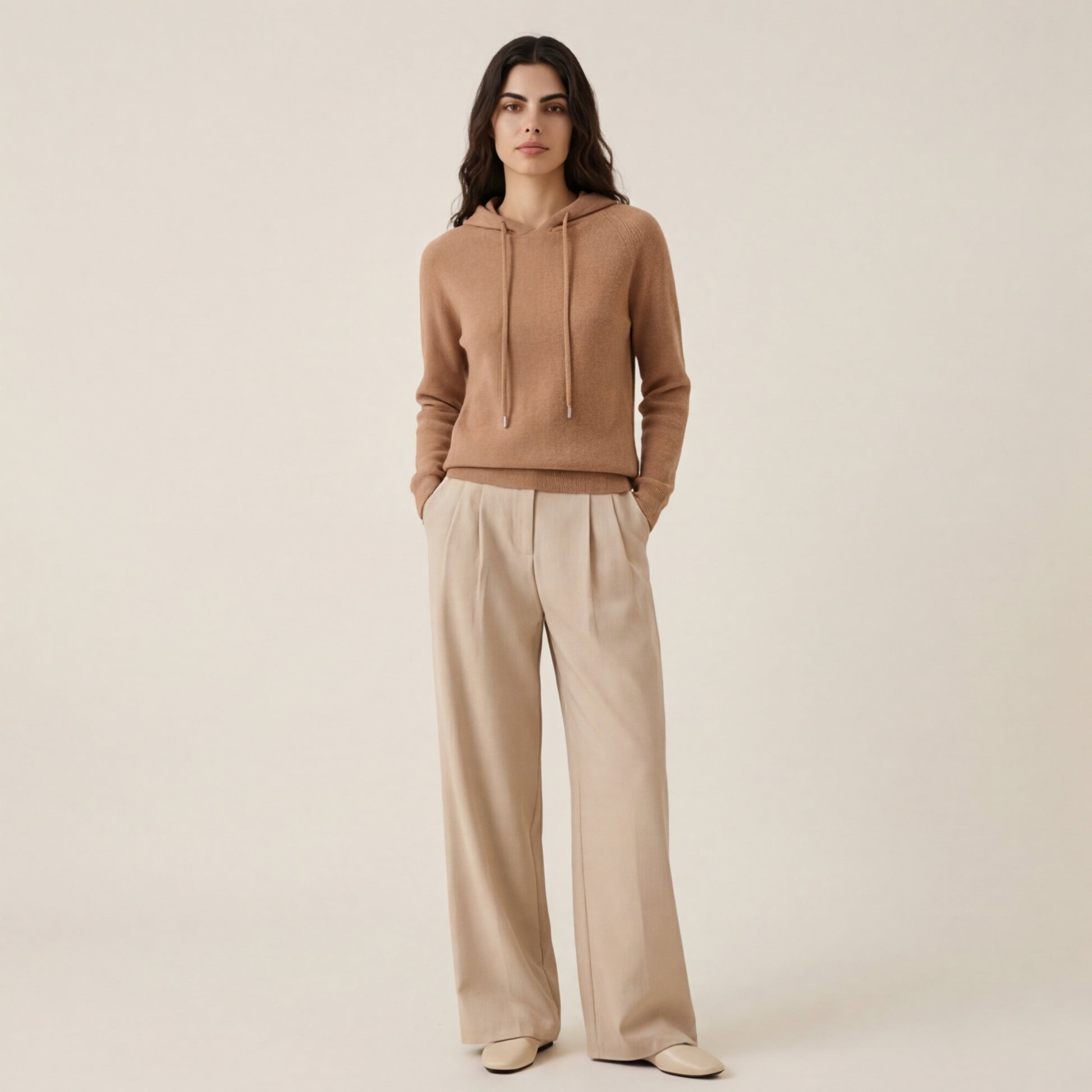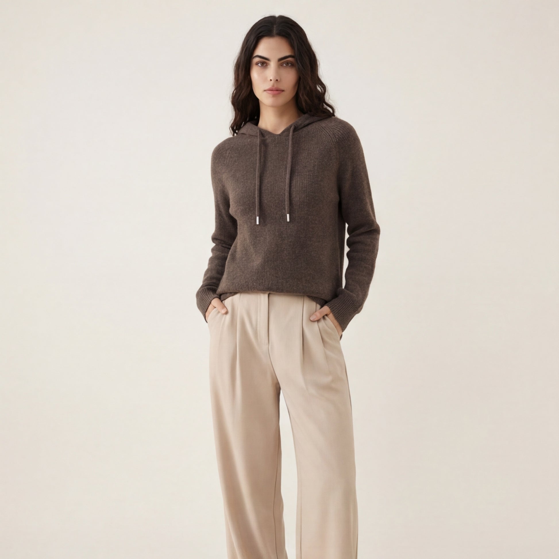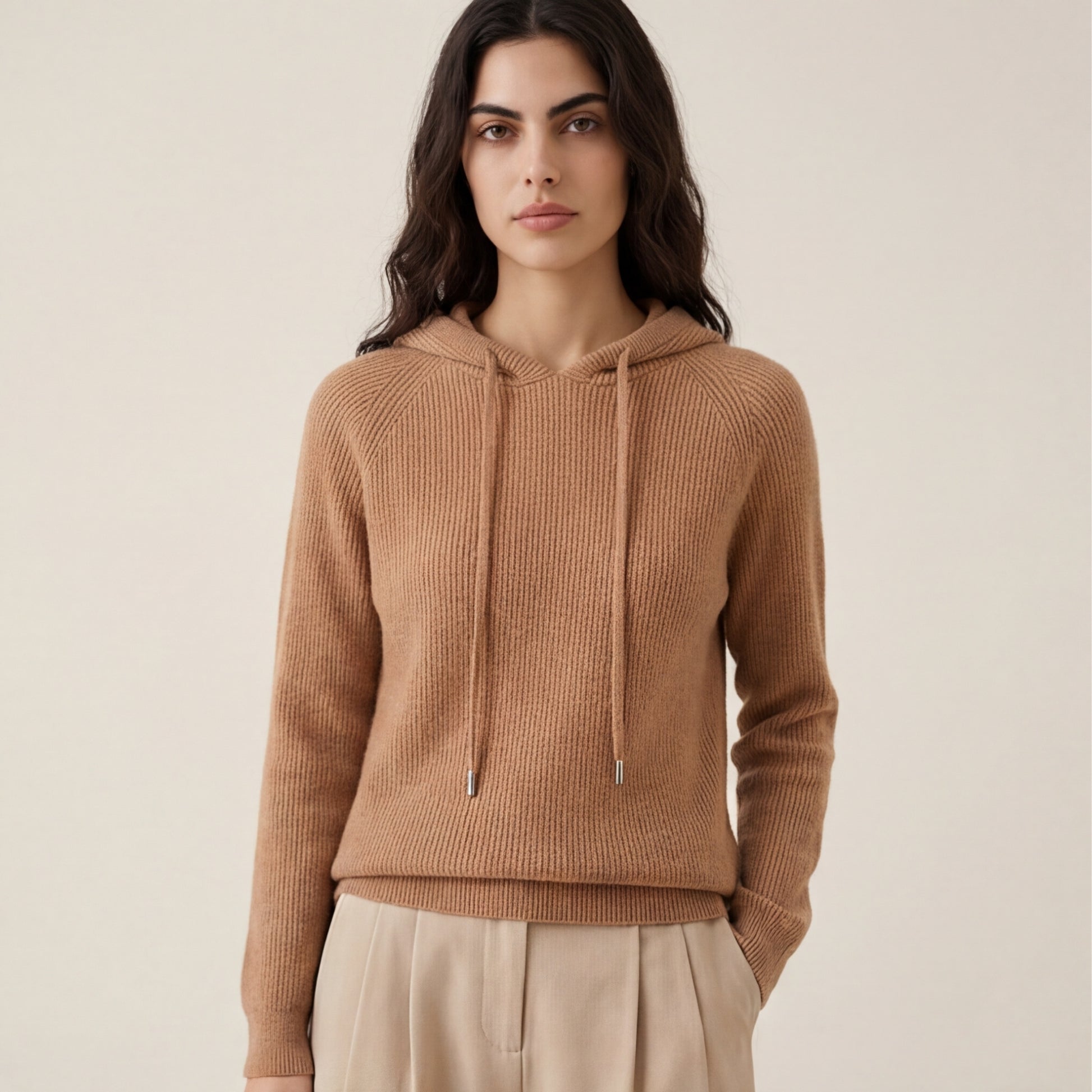 Wrap yourself in the cozy charm of the Women’s Hooded Cashmere Wool Knit Sweater. This sweater features a luxuriously soft wool-cashmere blend and a relaxed, hooded silhouette, making it perfect for crisp autumn and winter days.