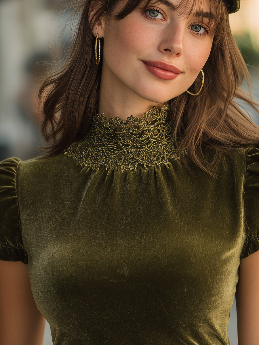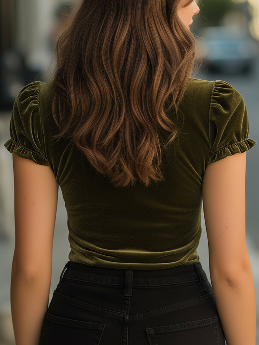 This olive green velvet top brings together understated luxury and refined femininity, designed for women who appreciate elegant details within a versatile silhouette. Crafted from a soft, lightly lustrous velvet fabric, the top offers a smooth, fluid drape that gently contours the body while maintaining all-day comfort.