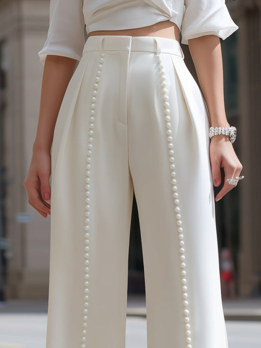 Pearl-Detail High-Waist Wide-Leg Tailored Trousers