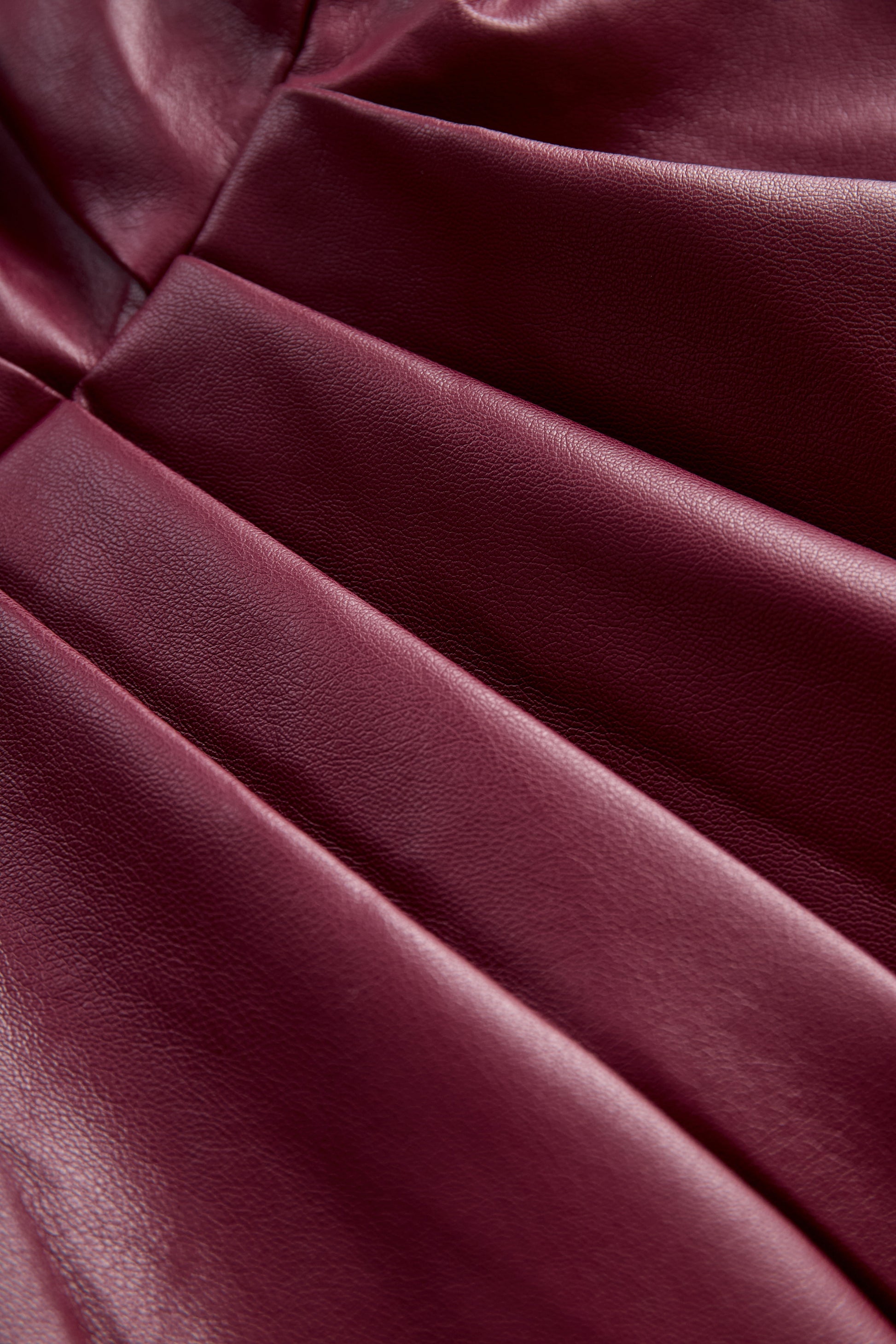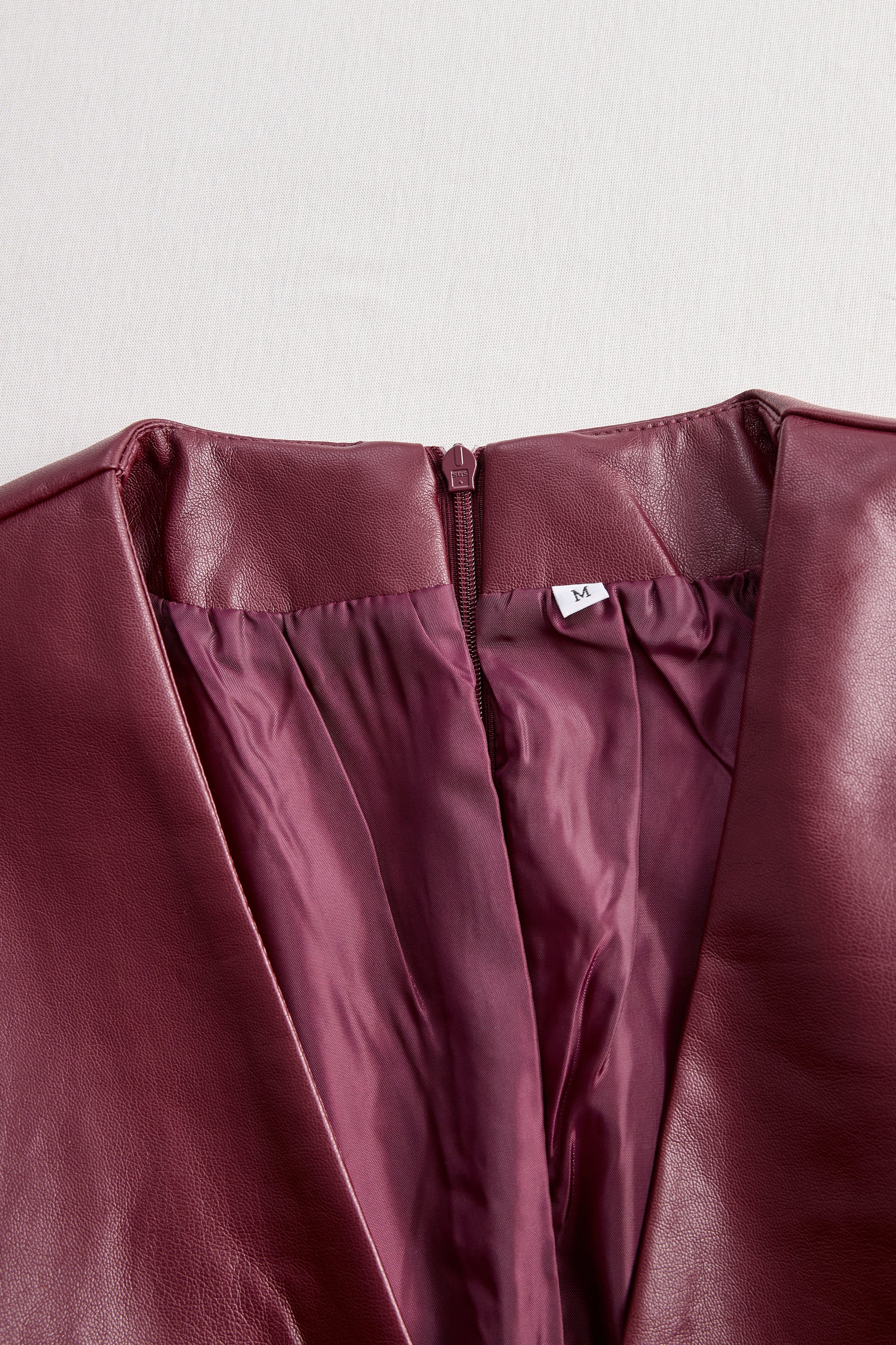 Elevate your wardrobe with this sophisticated leather dress, designed in a striking burgundy shade. The soft faux leather drapes effortlessly, while the fitted waist and A-line skirt offer a flattering silhouette. Pair it with minimal accessories for a polished, refined look.