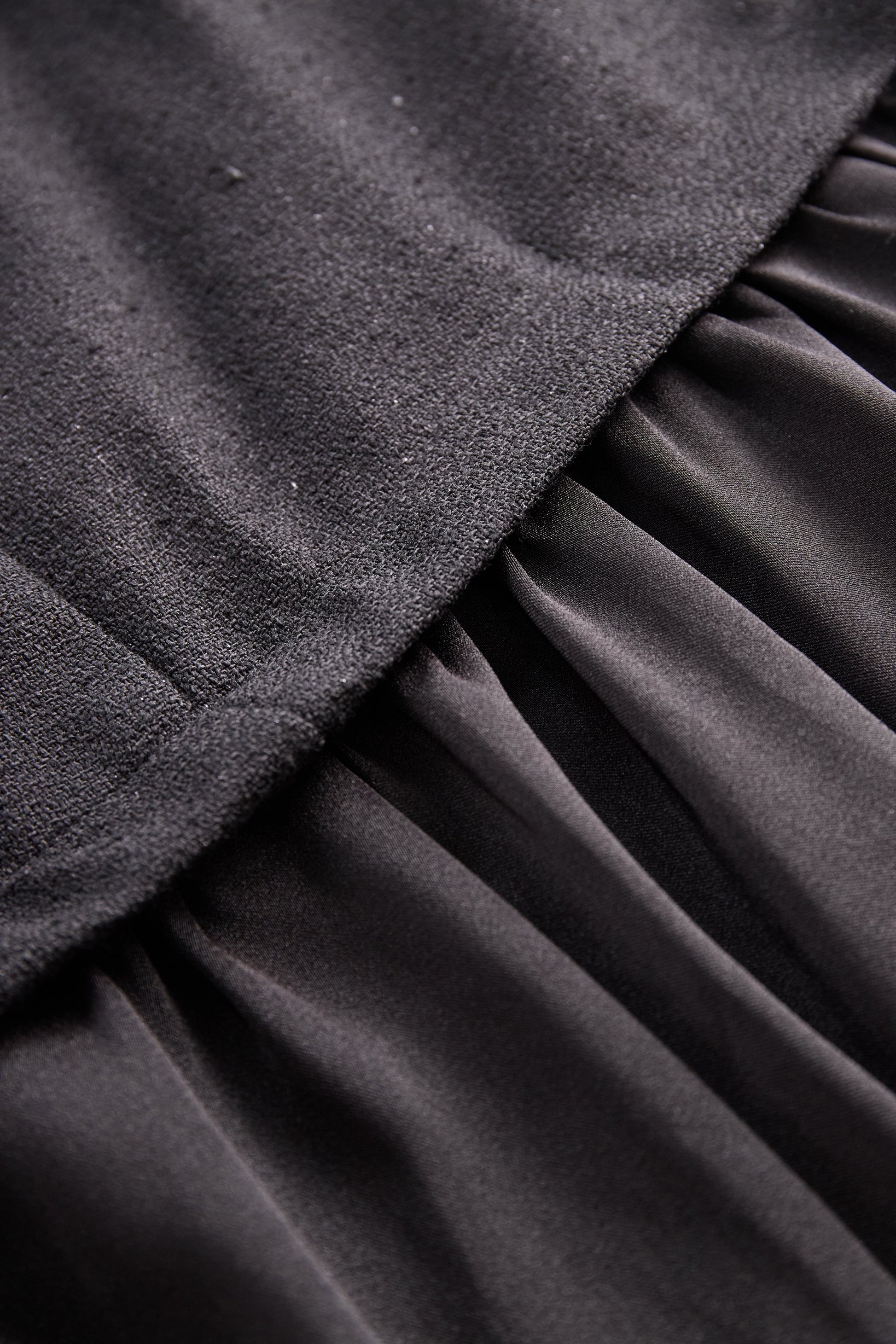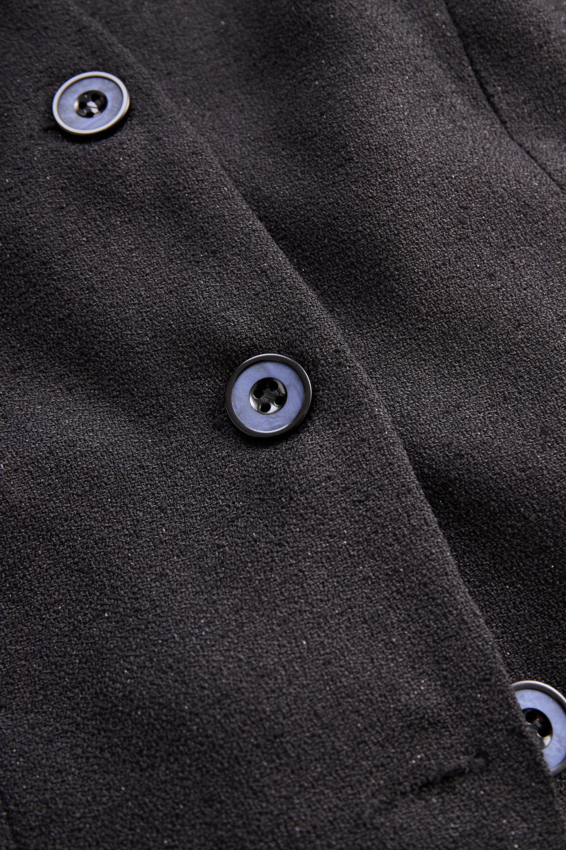 - Design: Fitted sleeveless vest with pearl buttons and V-neckline, gathered long skirt with a soft drape