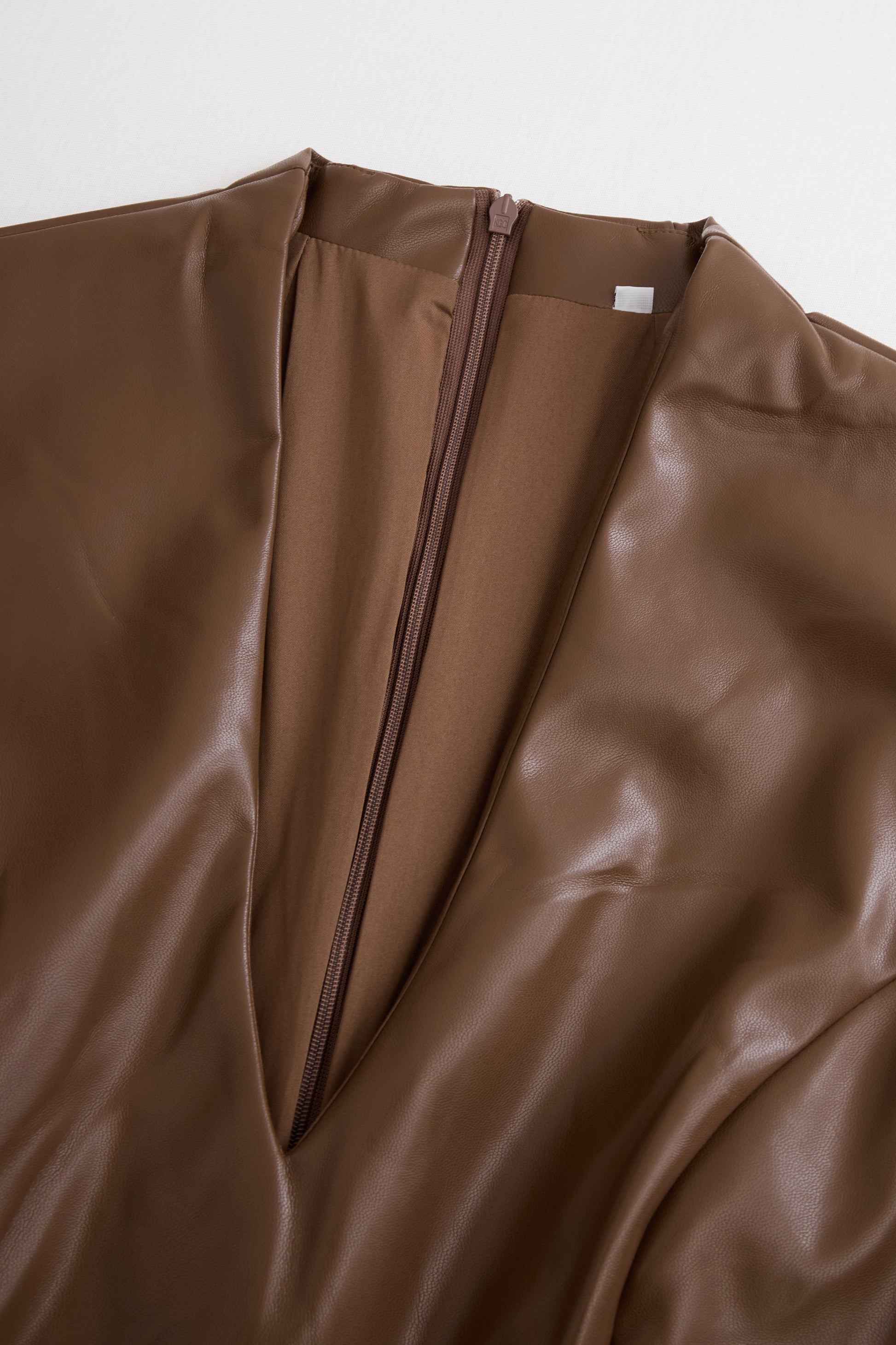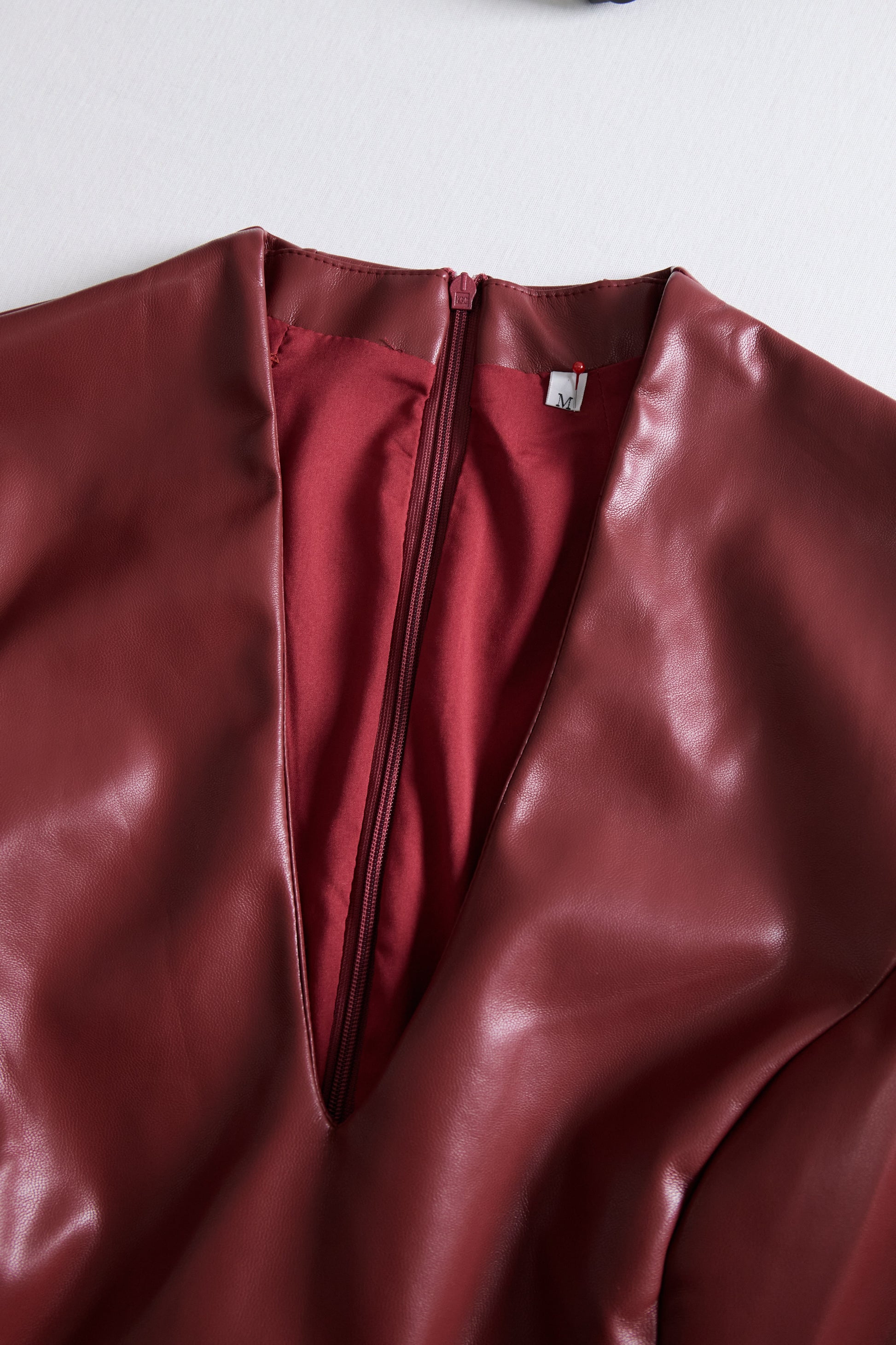 Mooyius presents the Sophisticated Black Faux Leather Bodycon Dress to elevate your sophisticated look. Make a bold statement in this black faux leather bodycon dress. Featuring a sharp V-neckline and long fitted sleeves, it contours the body for a sleek and confident silhouette.