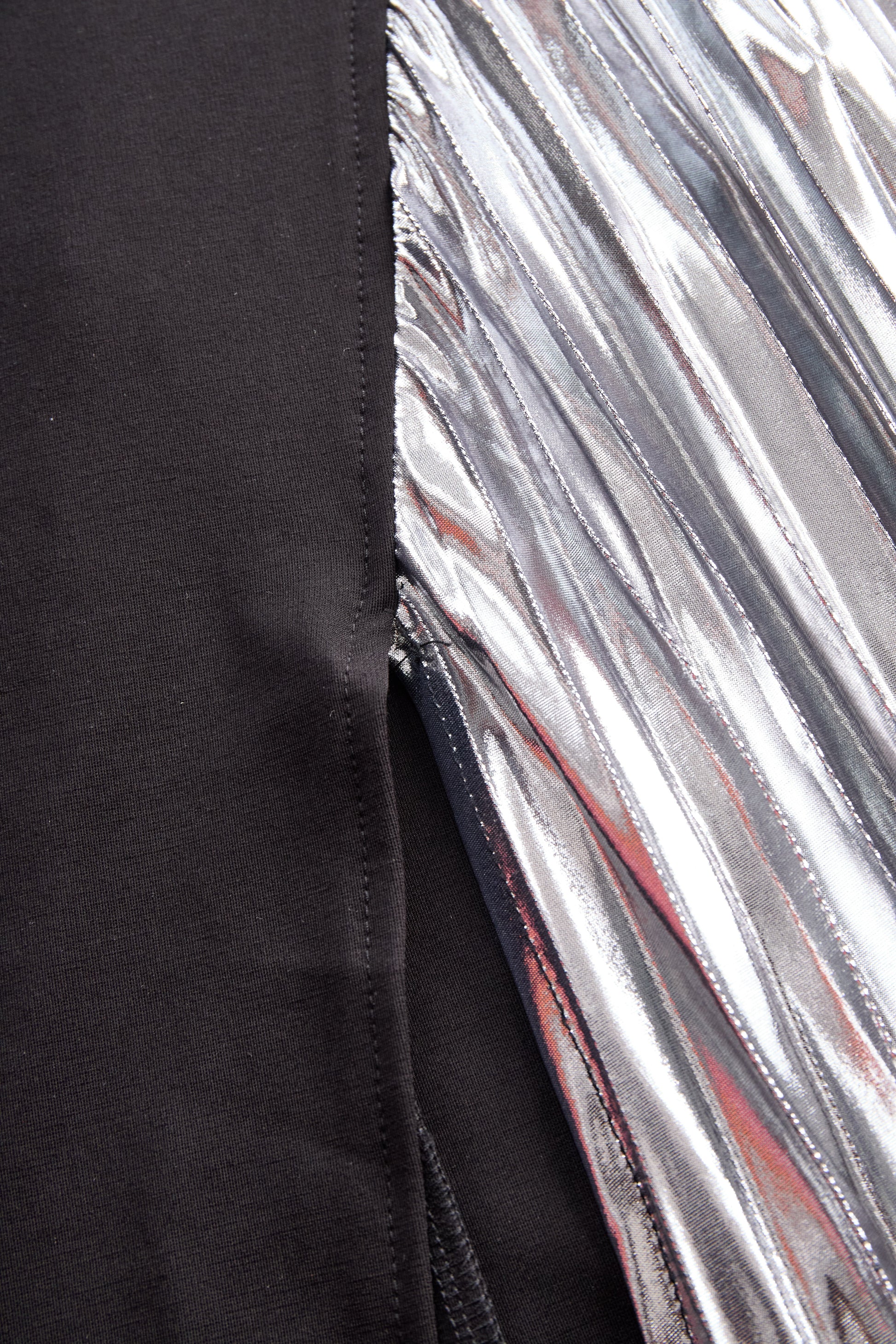 - Design: Metallic pleated panels at the chest and thigh slit