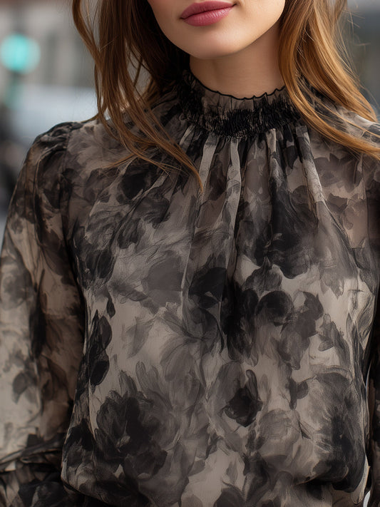 Sheer Floral Print High-Neck Long Sleeve Blouse