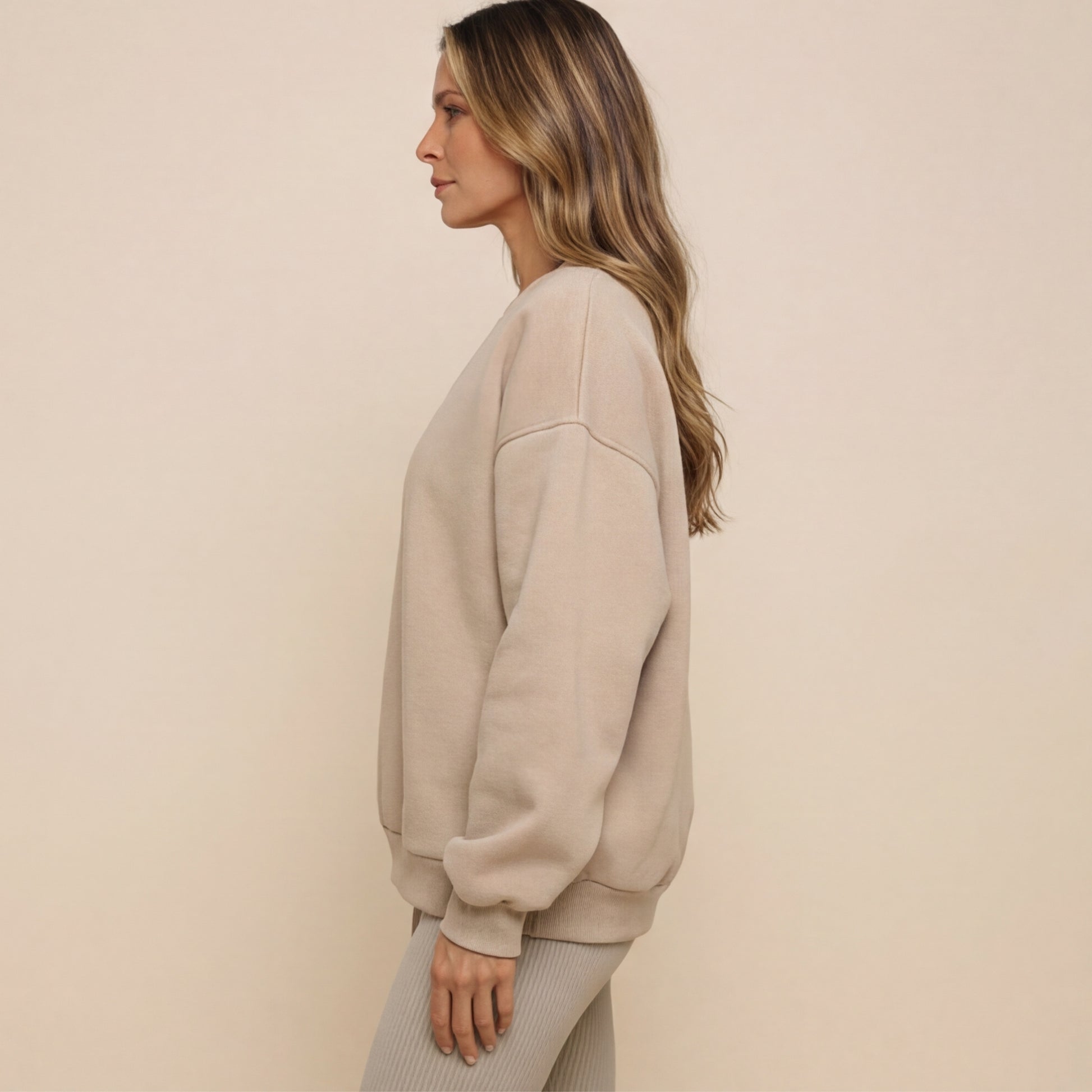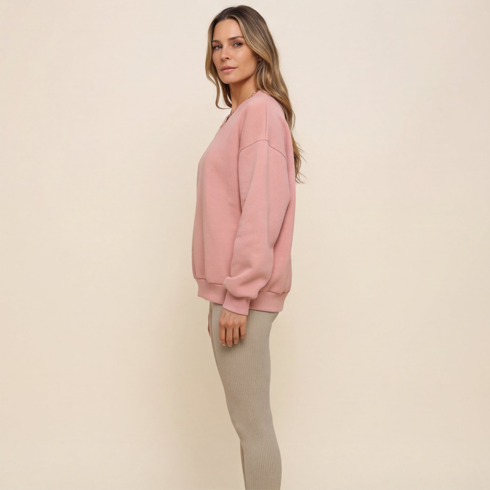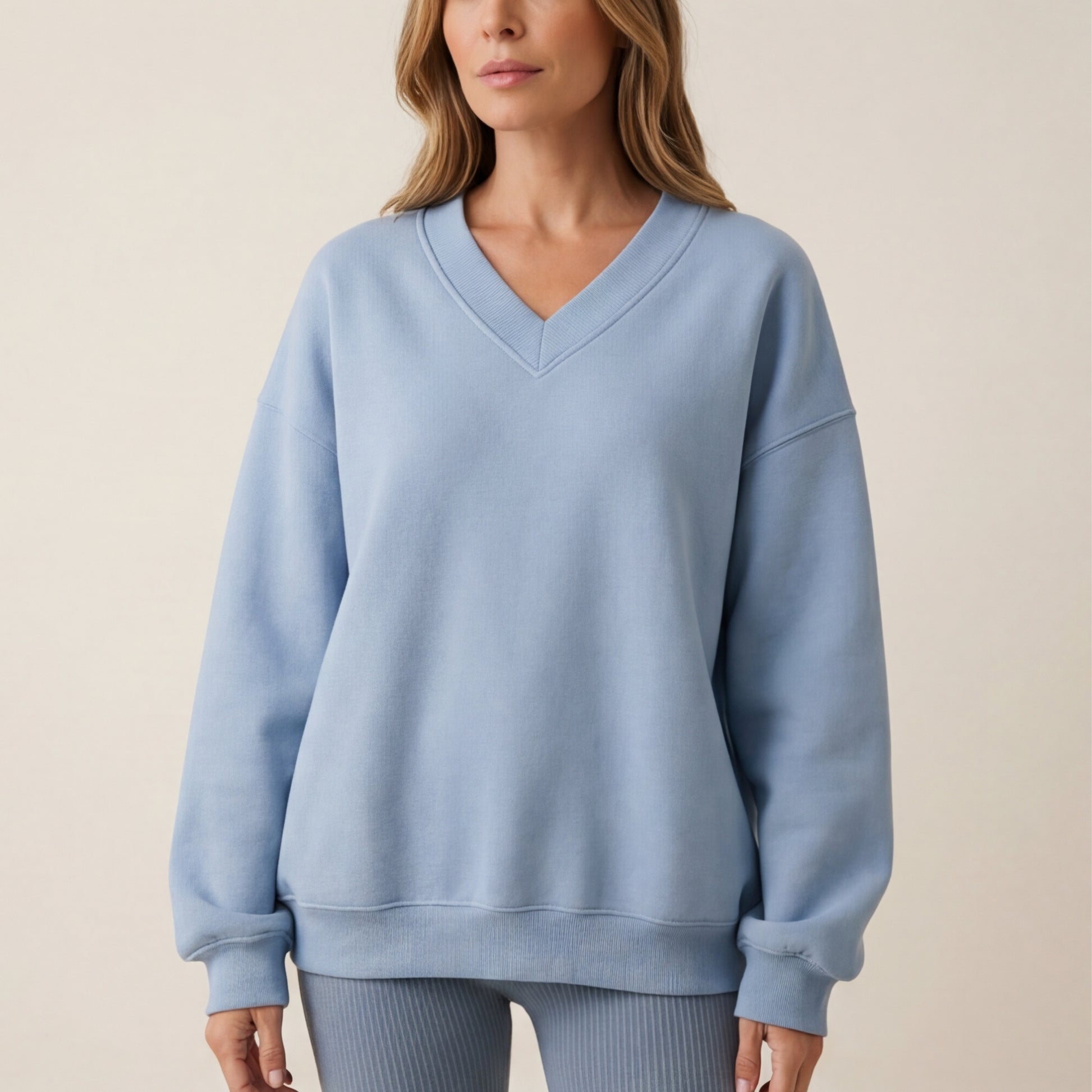 Experience the perfect blend of understated elegance and cozy warmth with our pastel-colored sweatshirt. Designed with a relaxed, oversized fit, it offers effortless drape and freedom of movement. The ribbed cuffs and stylish v-neckline elevate your look, making it a versatile addition to your wardrobe.