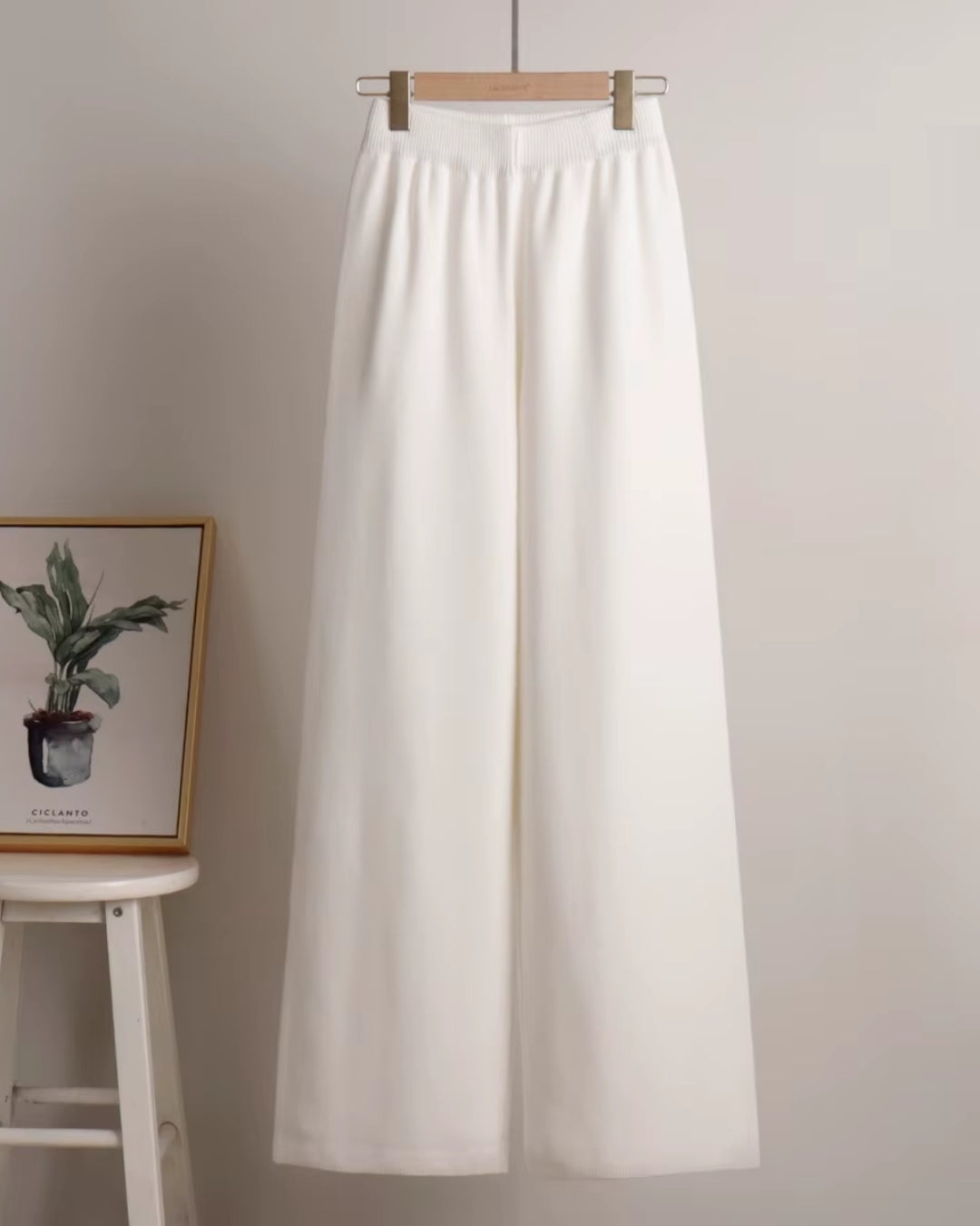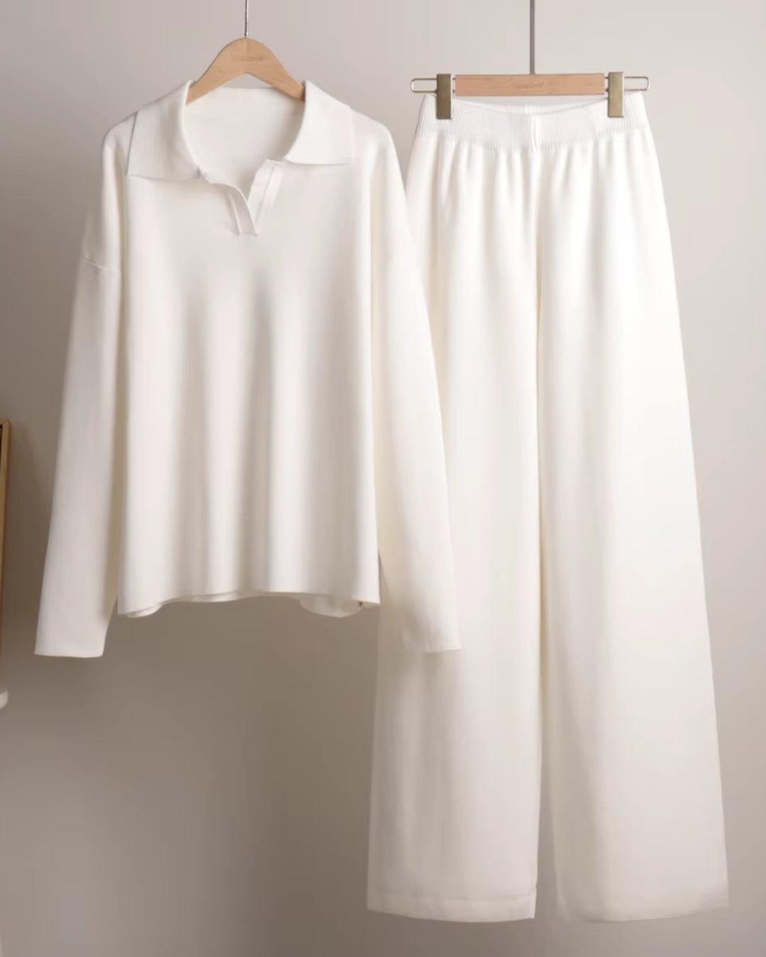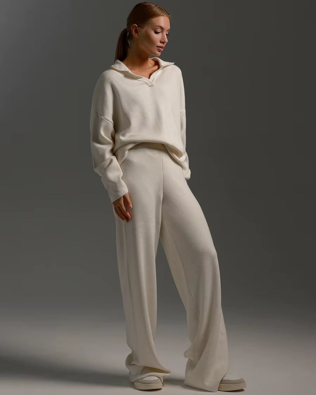 A refined two-piece ensemble that embodies effortless elegance. The polo-collar pullover pairs with wide-leg trousers in a soft knit blend, offering both comfort and sophistication. Designed for cooler seasons, this set transitions seamlessly from relaxed mornings to refined evenings. The relaxed silhouette ensures lasting ease, while the timeless design remains capsule-proof season after season.